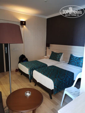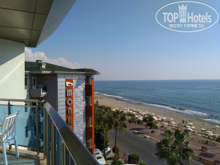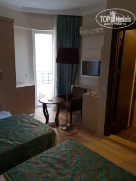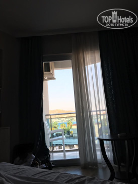 Сразу удивил тот факт , что у отеля нас ожидал служащий, который взял чемоданы и сопроводил нас к ресепшену. Нас моментально оформили, выдали ключ- карточку и в сопровождении того же служащего мы приехали на лифте на последний 5-й этаж( 6-й по нашему). Номер нам достался 5513, с боковым видом на море и соседний отель Монарт. Забыл упомянуть, что доставка в номер нам обошлась в 400 руб., которые мы отдали служащему в качестве благодарности за доставку. На самом деле больше из-за того, что он нежданно- негаданно выдал нам "комплимент"от отеля в виде двух наборчиков из бутерброда, сока и яблока. Забавно, что в самолете компании Южный ветер, которой мы летели из Шереметьево туда и обратно "'комплиментом" называли бесплатный стаканчик воды. Забегая вперёд, скажу, что такие же наборчики мы получили от отеля при раннем ( около часа ночи) отъезде из отеля, предварительно уведомив ресепшен.