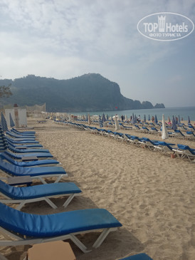 На пляже есть всё необходимое: исправные лежаки и зонты, чистые матрасы. Бар на пляже с напитками и едой (за доп плату), наичистейший туалет. Работники пляжа следят за территорией и чистотой. Заход в море хороший, местами есть плита (вдоль берега Алании он весь такой), но есть абсолютно хорошие заходы, именно на этом пляже есть хороший заход! Читаю другие отзывы и не понимаю пишущих, кто говорит что заходить плохо. Есть песок, есть камушки, все отлично! Кто любит плавать в маске, возьмите, потому что можно в плите наблюдать подводный морской мир😍